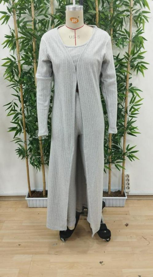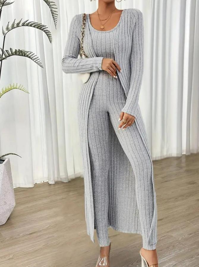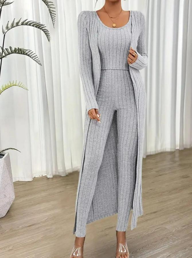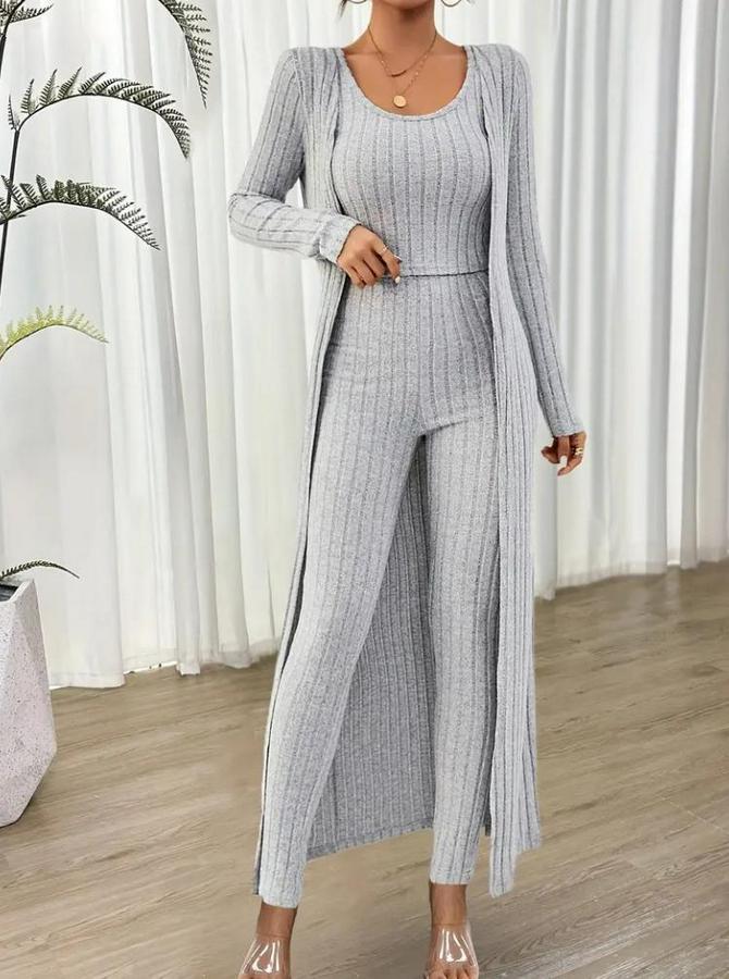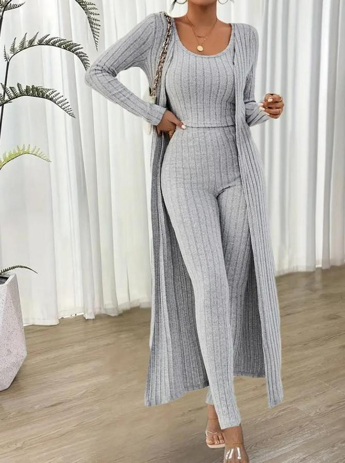 Kadın Yuvarlak Yaka Askılı Krop Bluz Yüksek Bel Tayt Ve Uzun Hırka şardonlu Kaşkorse üçlü Takım