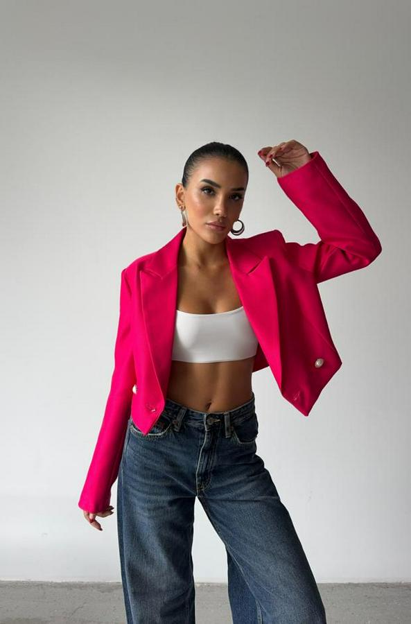 ARKASI İNCİ DÜĞME DETAYLI CROP CEKET - Fuşya