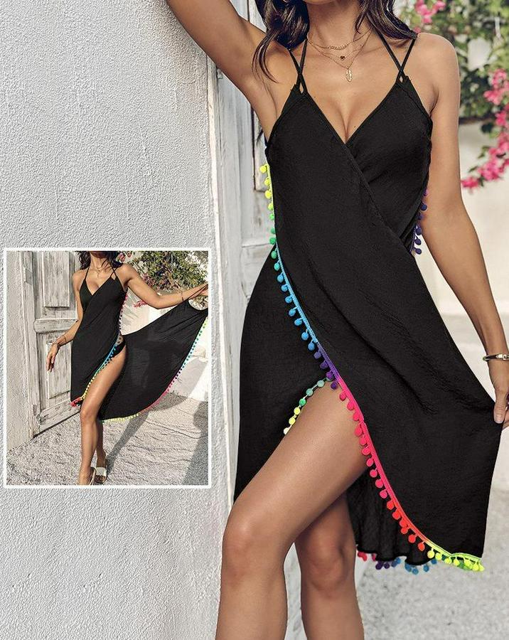 Kadın Askılı Derin V Yakalı çapraz Geçmeli Ponponlu Bürümcük Pareo