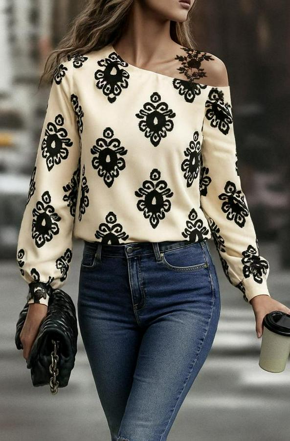 AnasayfaTüm ÜrünlerÜst GiyimBluz & TunikBluzAskılı Uzun Kollu Omuzlardan Açık Desenli Mosskrep Bluz