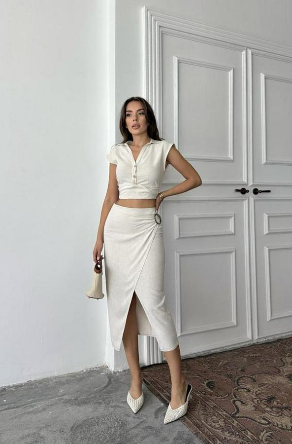 Bej Keten Gömlek Ve Etek Takım