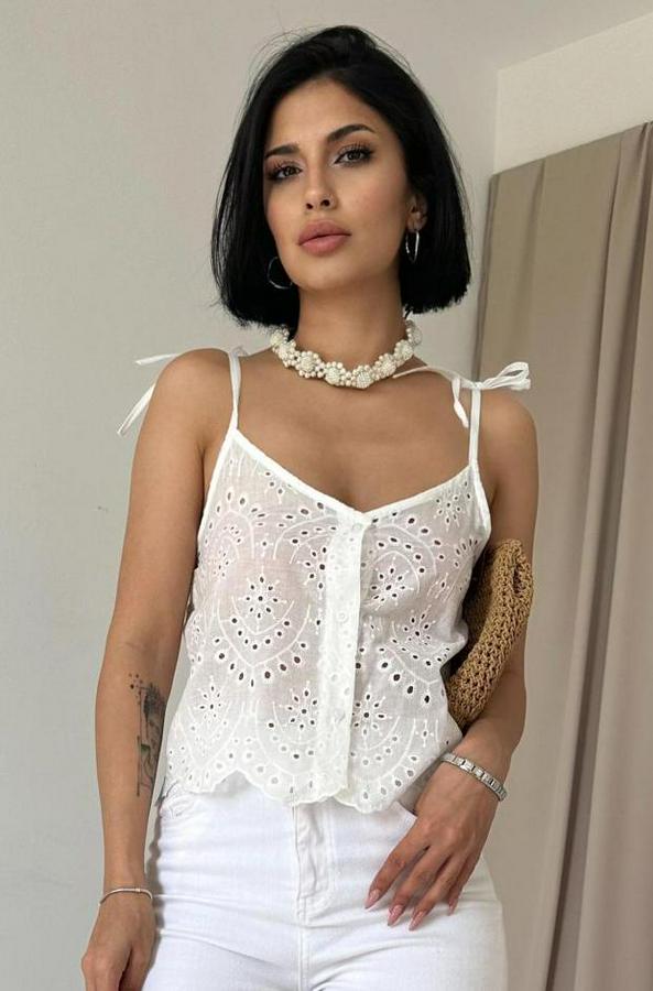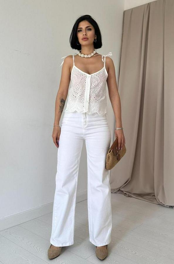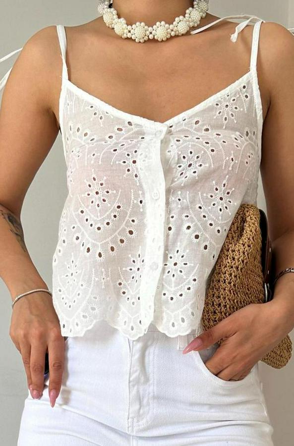 Beyaz Bağcıklı Brode Bluz