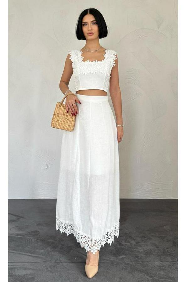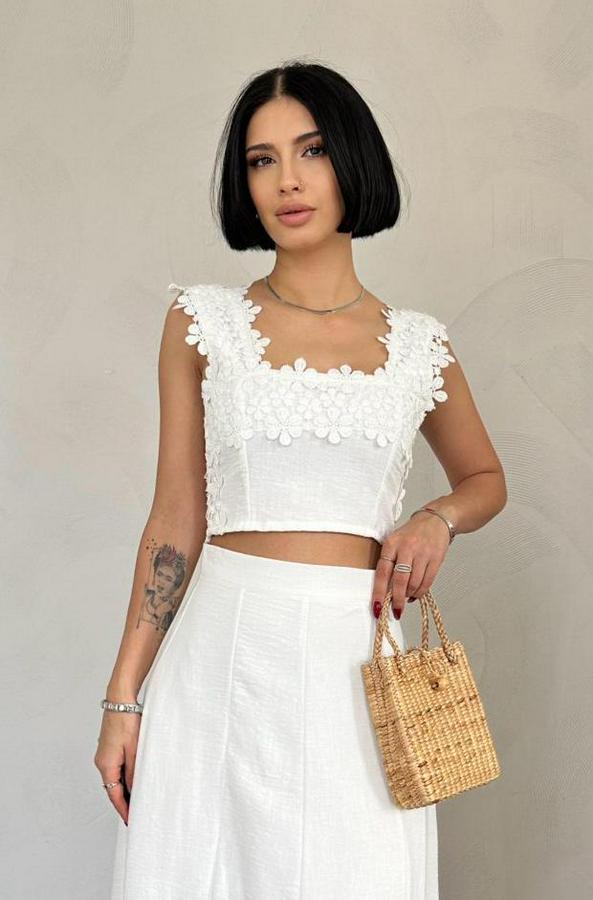 AnasayfaTüm ÜrünlerÜst GiyimBluz & TunikBluzBeyaz Güpürlü Crop Ve Etek Takım