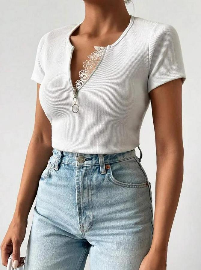 Kadın Beyaz Yaka Dantel Ve Fermuarlı Kaşkorse Bluz