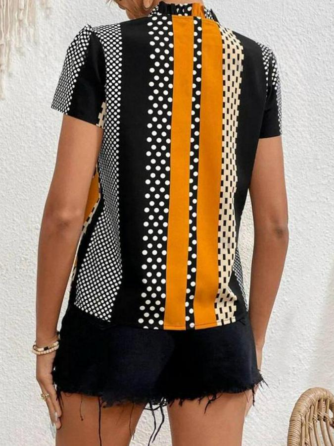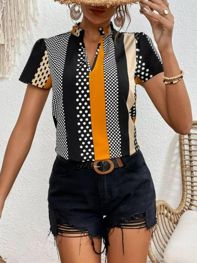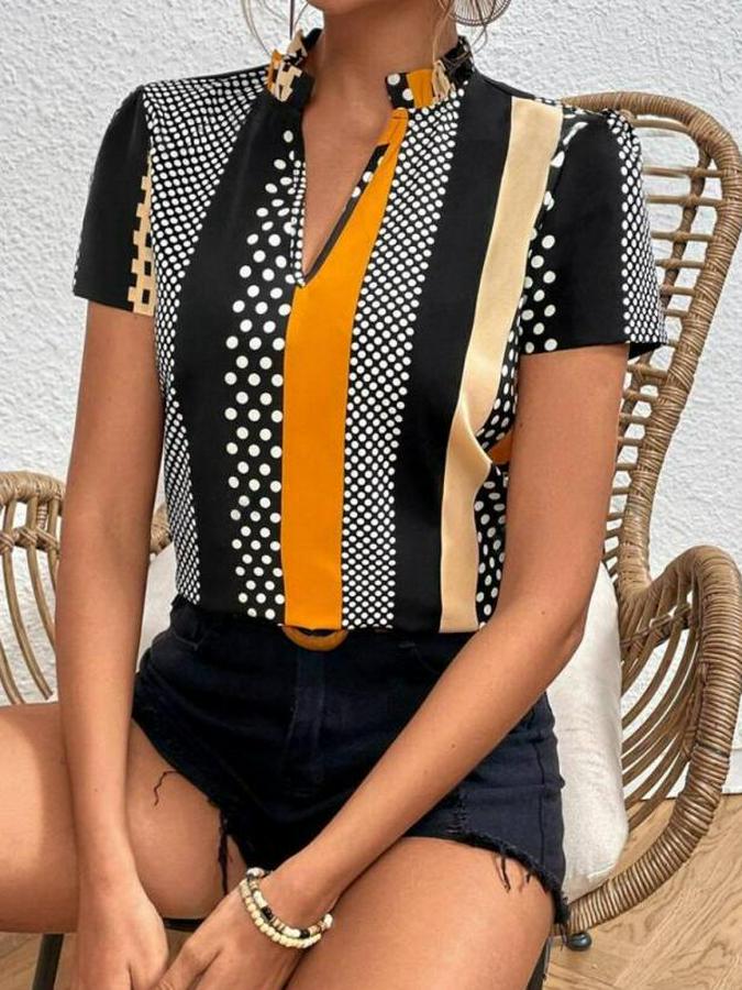 Çentik Ve Büzgülü Yaka, Desenli Mikro Kumaş Bluz