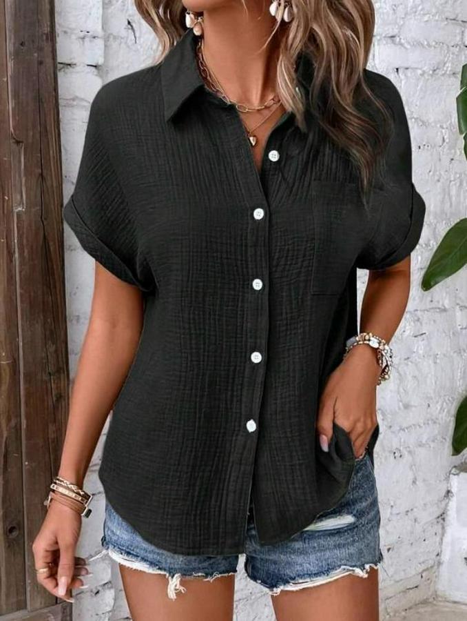 Kadın Cep Detaylı Kısa Kollu Müslin Kumaş Gömlek