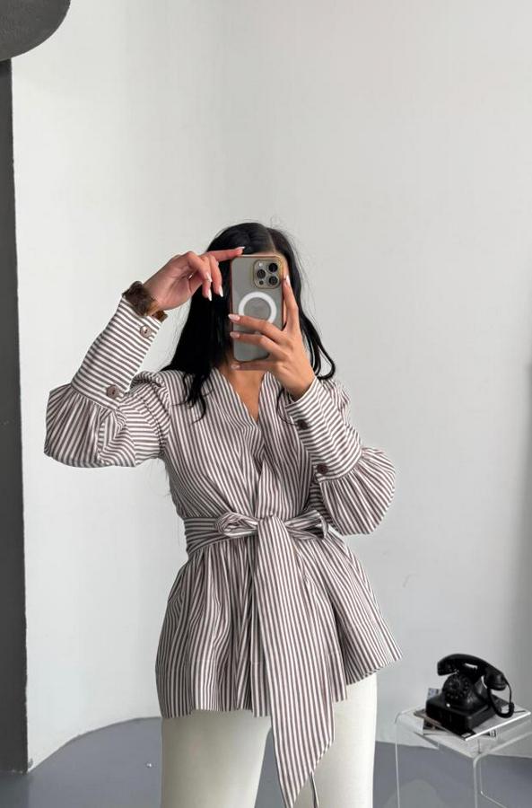 ÇİZGİLİ BAĞLAMA DETAYLI KRUVAZE POPLİN GÖMLEK - Kahverengi
