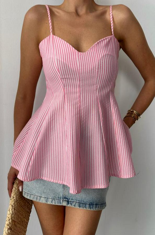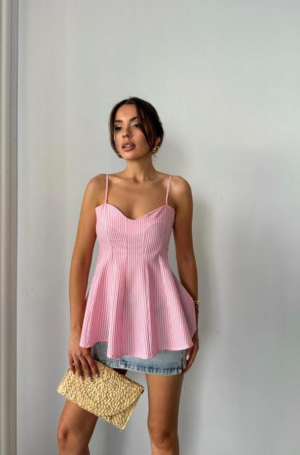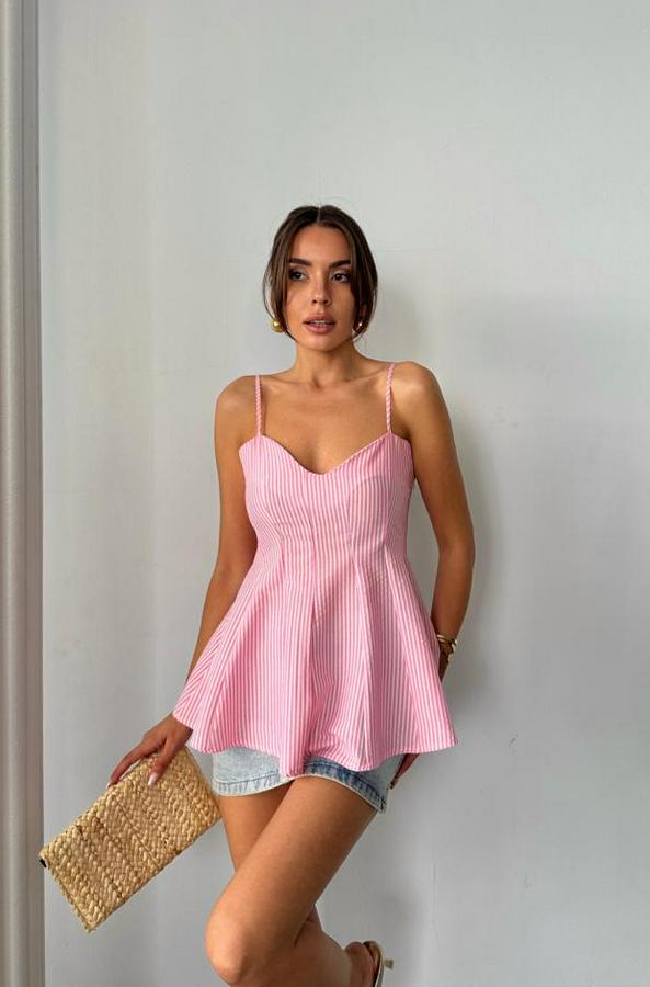 ÇİZGİLİ GOFRE ASKILI PENS DETAYLI BLUZ - Pembe