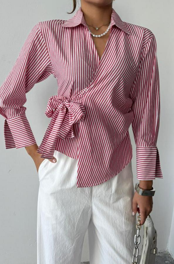 Çizgili Poplin Kruvaze Bağlamali Gömlek