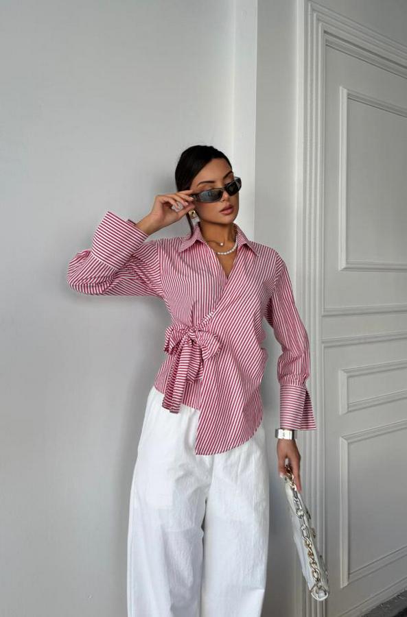 ÇİZGİLİ POPLİN KRUVAZE BAĞLAMALI GÖMLEK - Kırmızı