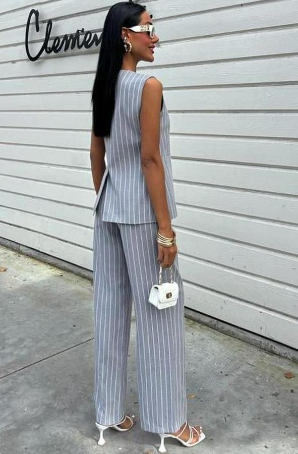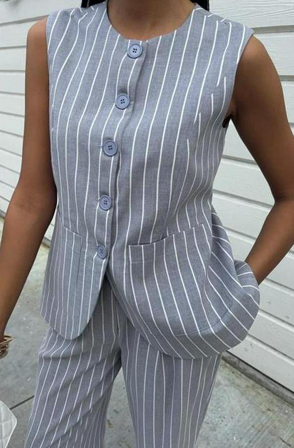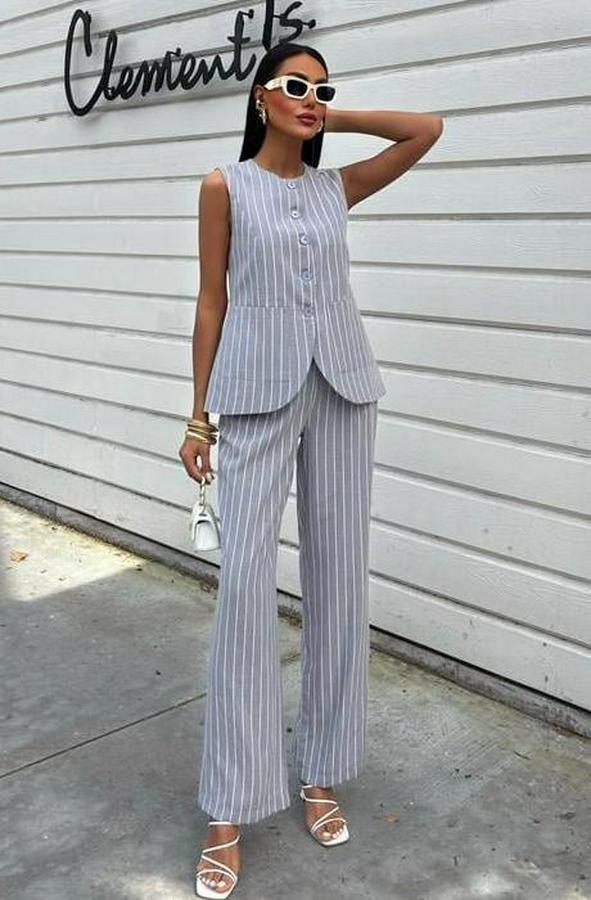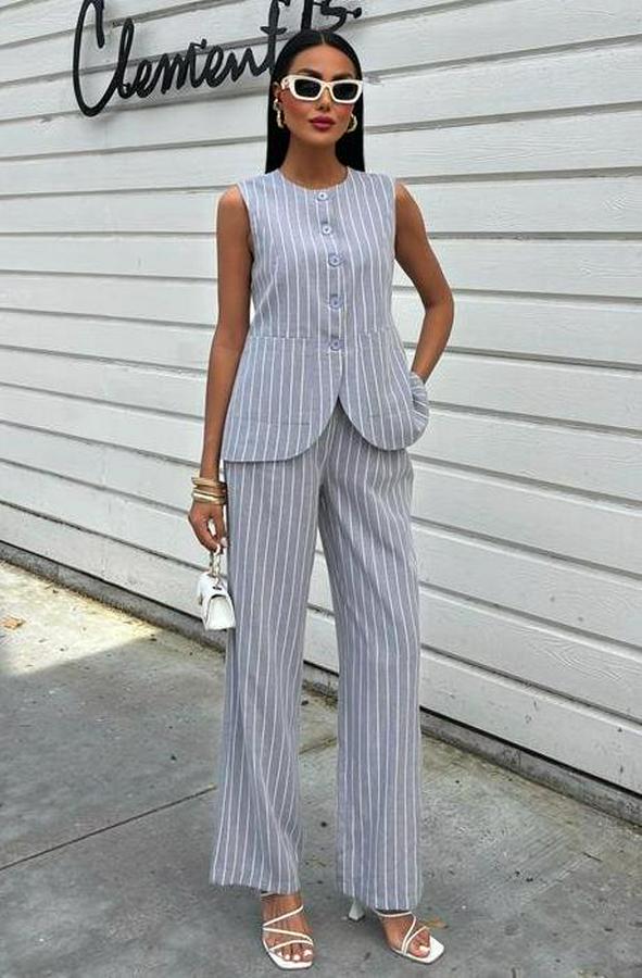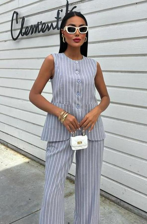 AnasayfaTüm ÜrünlerÜst GiyimBluz & TunikBluzÇizgili Viscon Keten Yelekli Rahat Takım 10121