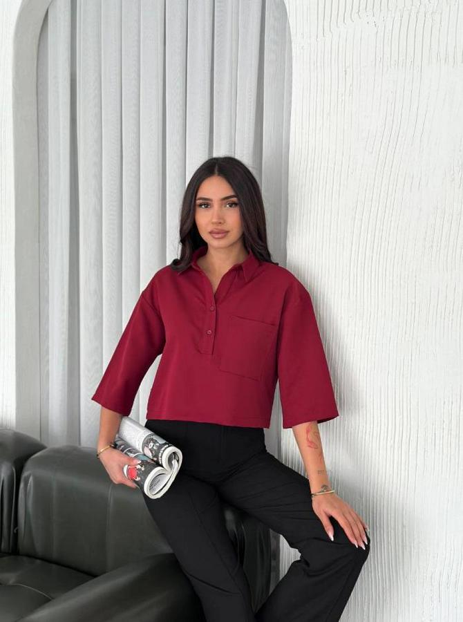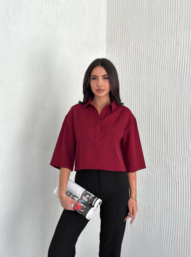 Crop Yakalı Gömlek Üç Çeyrek Sleeve Kol - Bordo