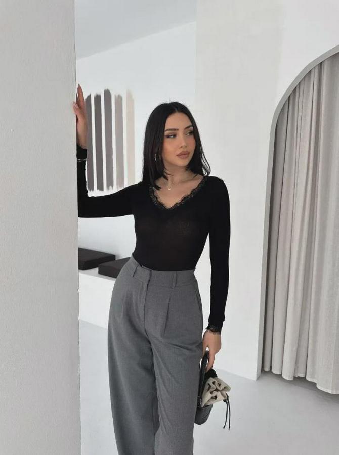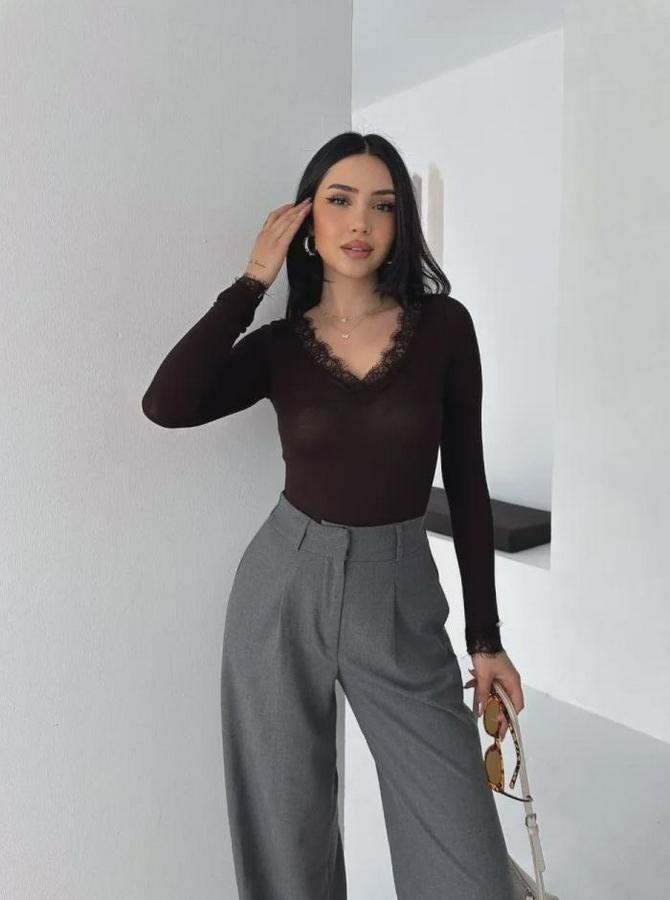 Dantel Detaylı V Yaka Arkası V Yaka Kaşmir Dokulu Uzun Kollu Bluz