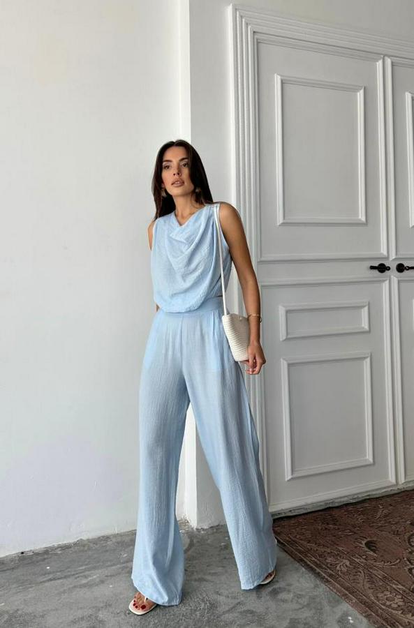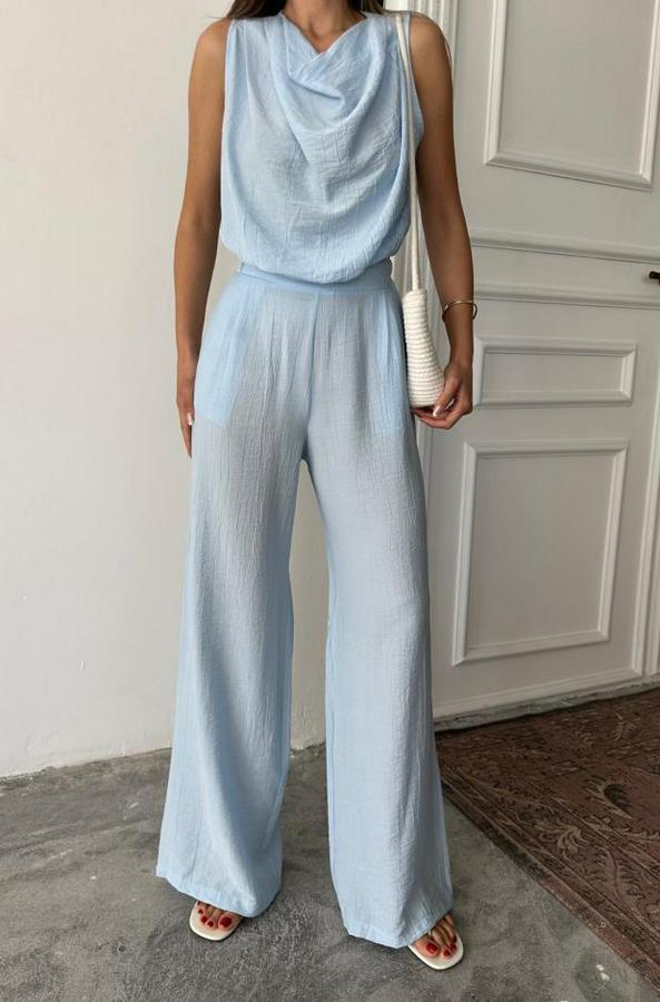 DEGAJE YAKA KOLSUZ BLUZ - PANTOLON TAKIM - Mavi