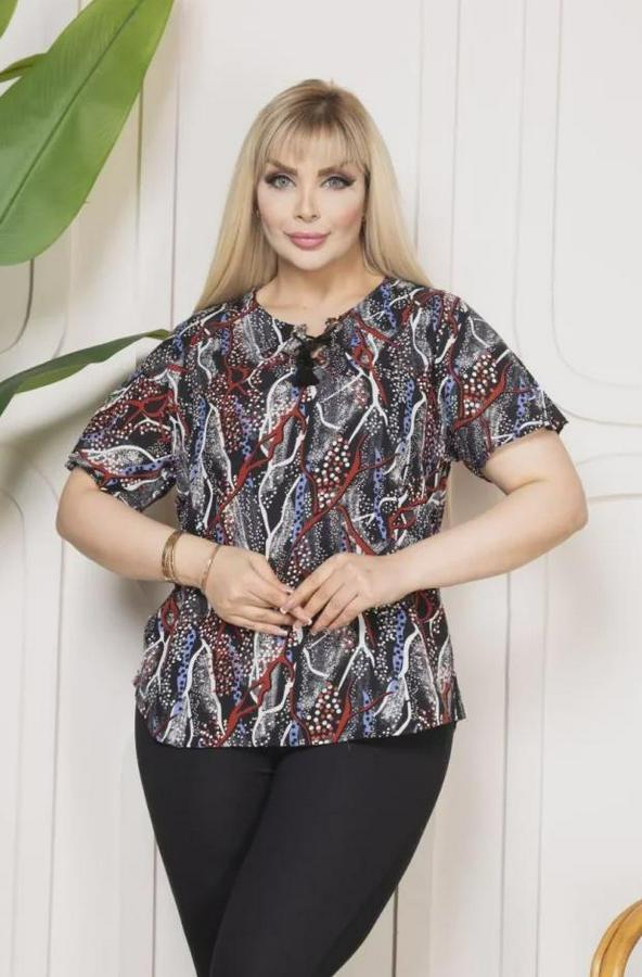 Desenli Püsküllü Viskon Bluz Bebe Yaka Kısa Kollu Big Size Rahat Kesim