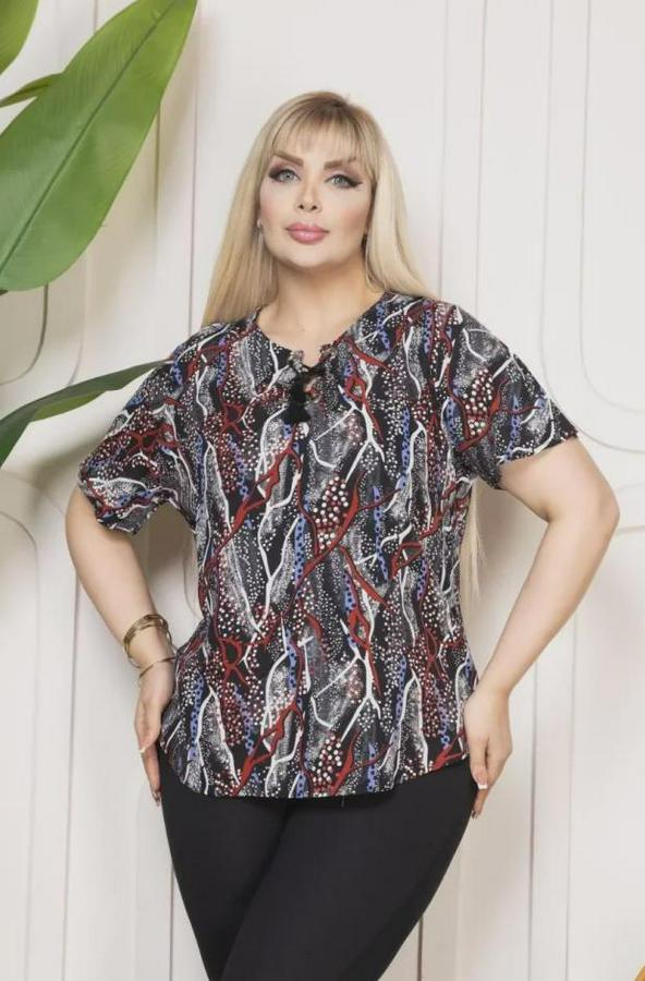 Desenli Püsküllü Viskon Bluz Bebe Yaka Kısa Kollu Big Size Rahat Kesim - Desenli