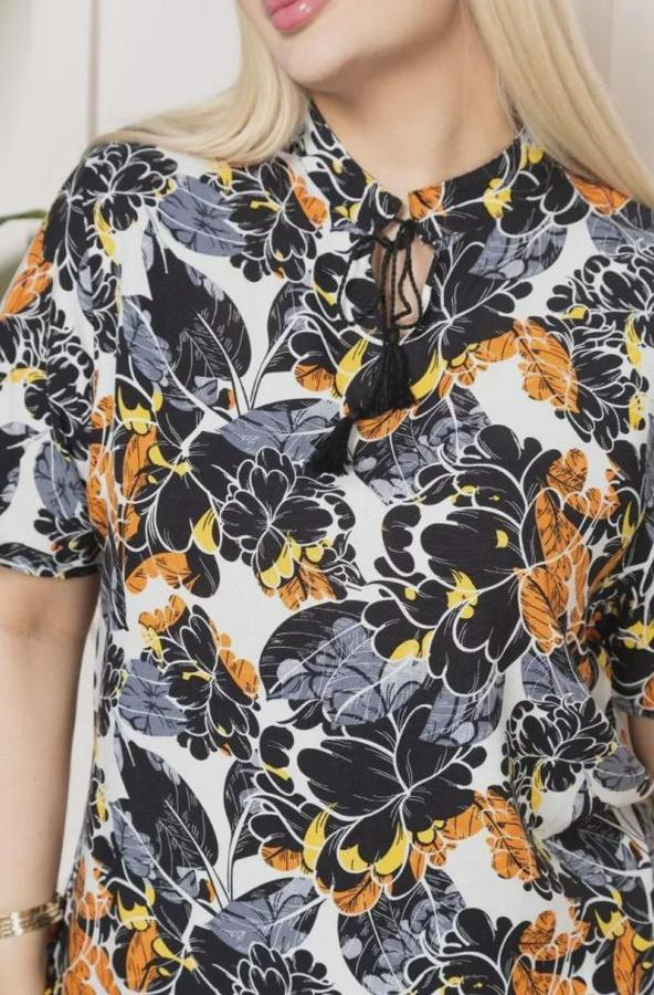 AnasayfaTüm ÜrünlerÜst GiyimBluz & TunikBluzDesenli Püsküllü Viskon Bluz Bebe Yaka Kısa Kollu Big Size Rahat Kesim