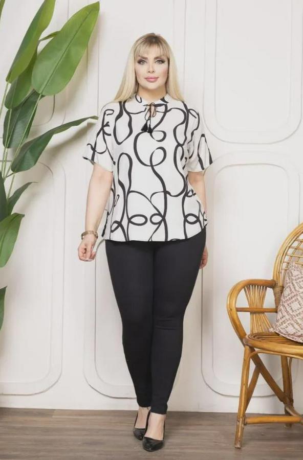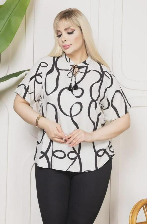 Desenli Püsküllü Viskon Bluz Bebe Yaka Kısa Kollu Big Size Rahat Kesim - Desenli