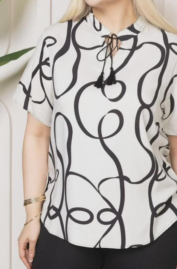 AnasayfaTüm ÜrünlerÜst GiyimBluz & TunikBluzDesenli Püsküllü Viskon Bluz Bebe Yaka Kısa Kollu Big Size Rahat Kesim