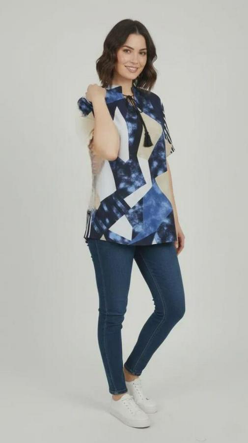 AnasayfaTüm ÜrünlerÜst GiyimBluz & TunikBluzDesenli Püsküllü Viskon Bluz Bebe Yaka Kısa Kollu Big Size Rahat Kesim