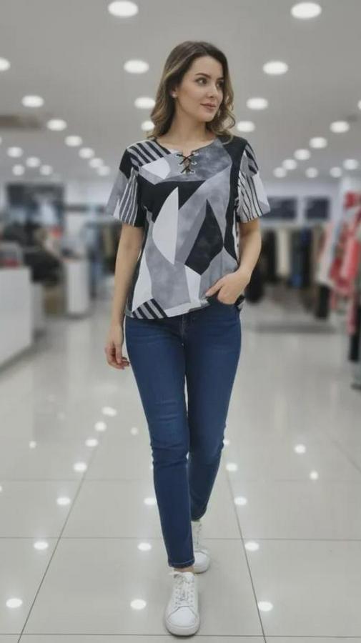 AnasayfaTüm ÜrünlerÜst GiyimBluz & TunikBluzDesenli Püsküllü Viskon Bluz Bebe Yaka Kısa Kollu Big Size Rahat Kesim