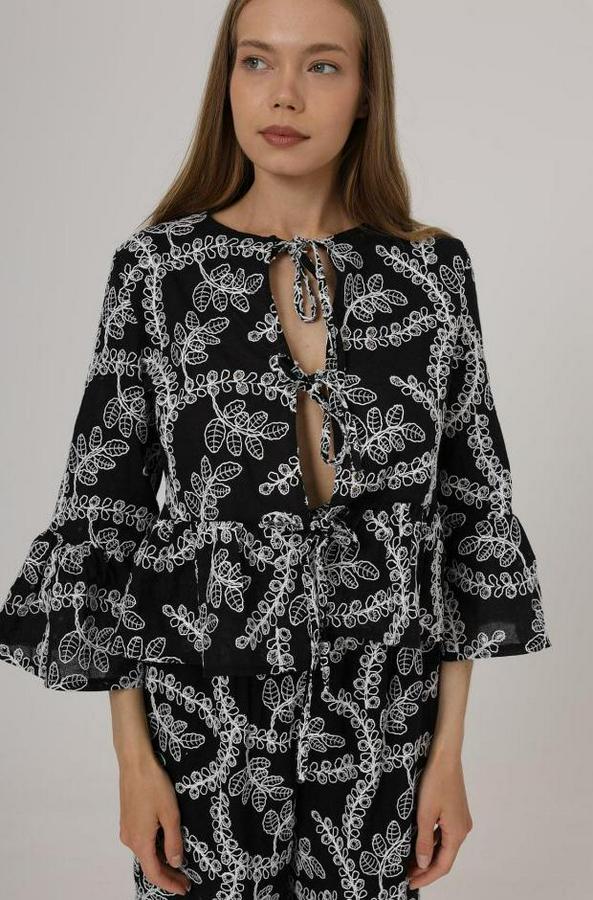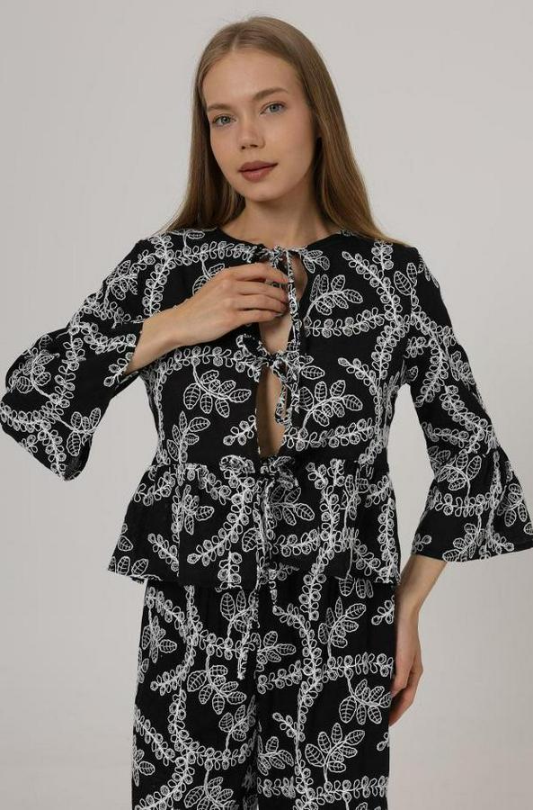 Fiyonk Bağlamalı Brode Bluz - Siyah