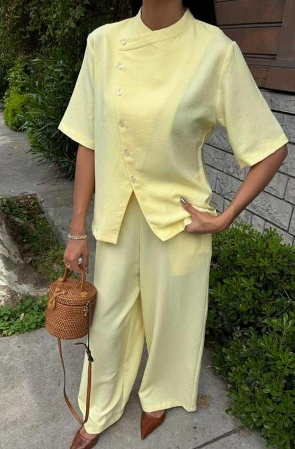 AnasayfaTüm ÜrünlerÜst GiyimBluz & TunikBluzHakim Yaka Çapraz Düğmeli Plazzo Pantolon Viscon Keten Takım