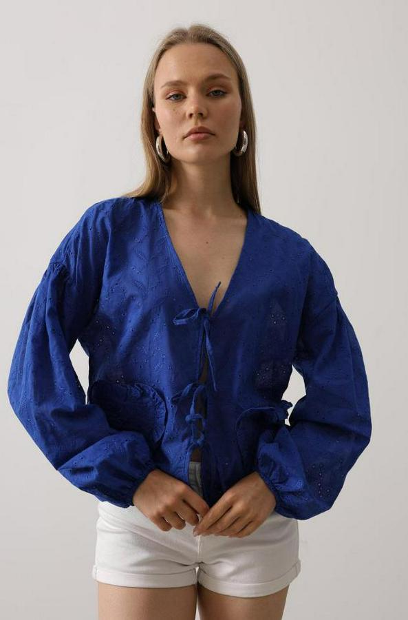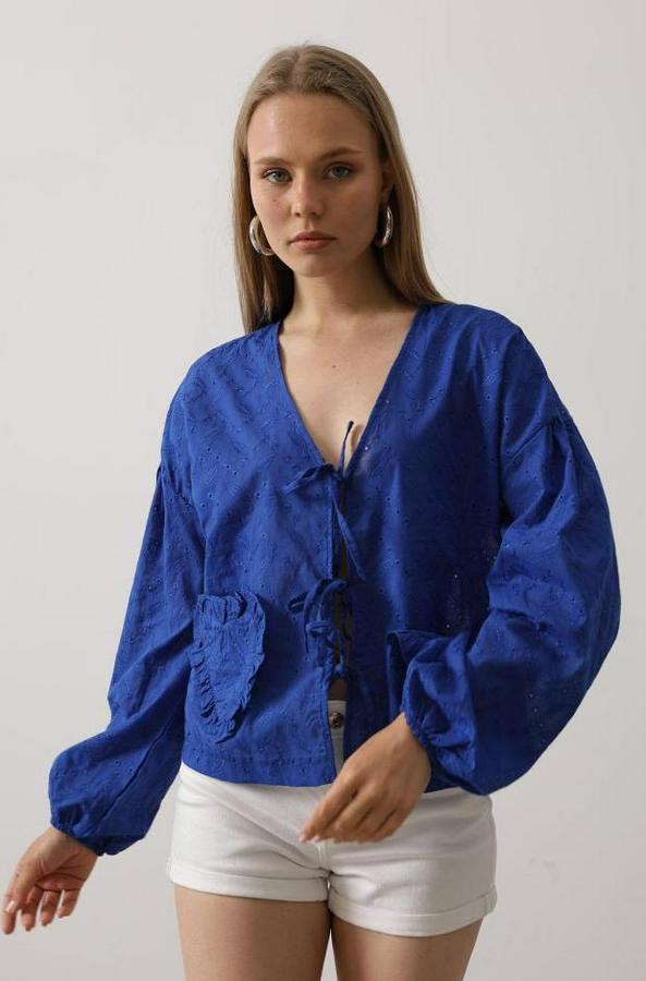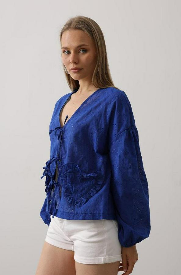 Kalp Detaylı Bağlamalı Brode Bluz - Saks