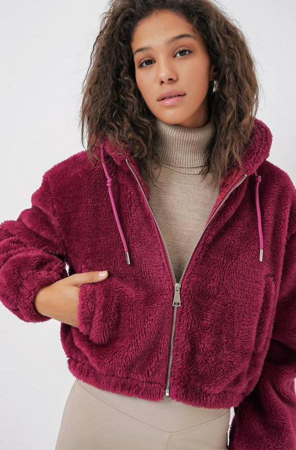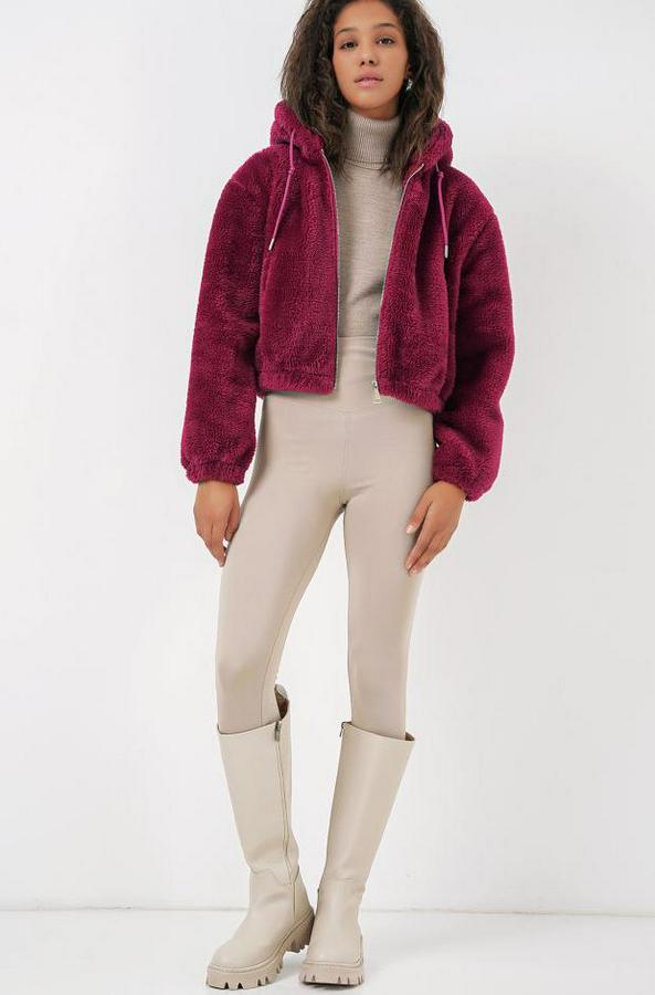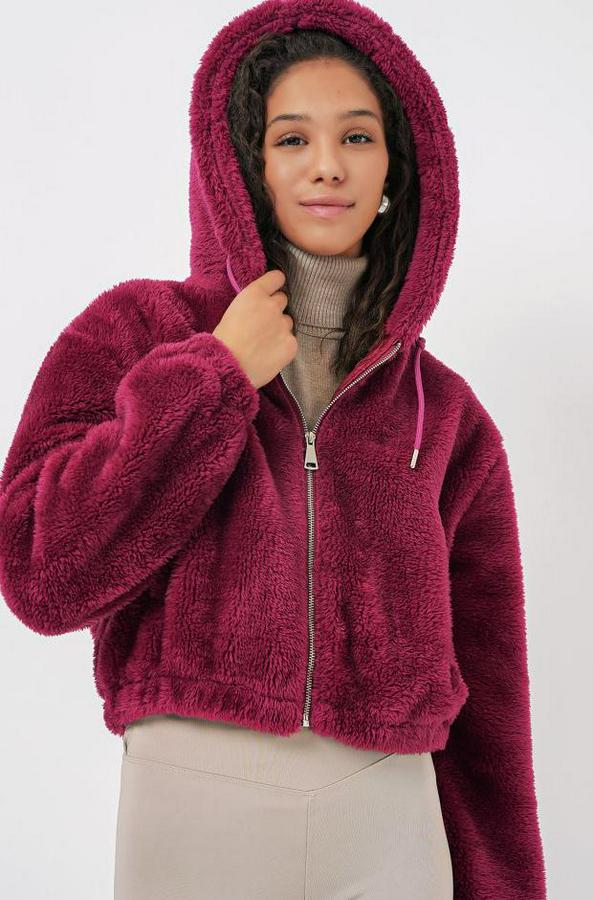 5193 Kapüşonlu Peluş Crop Ceket - Mürdüm