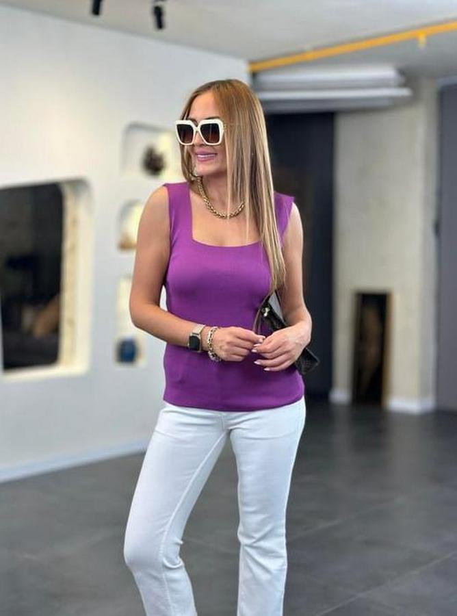 Kare Yaka Kalın Askılı Beyaz Triko Bluz