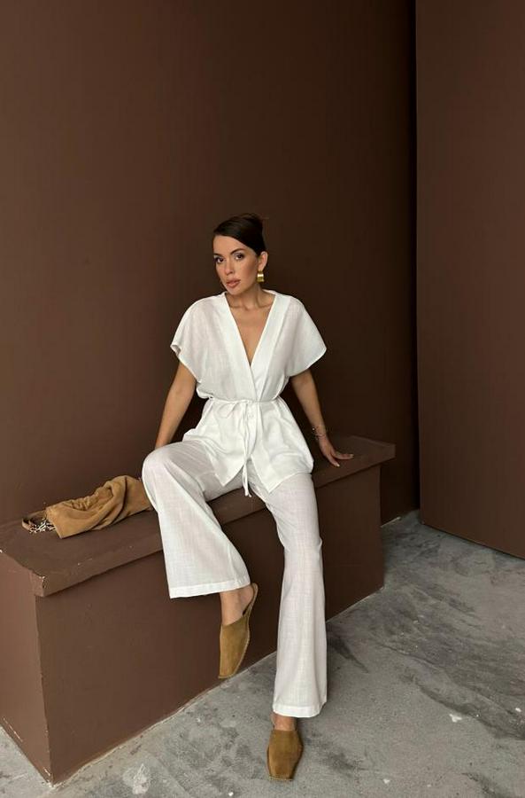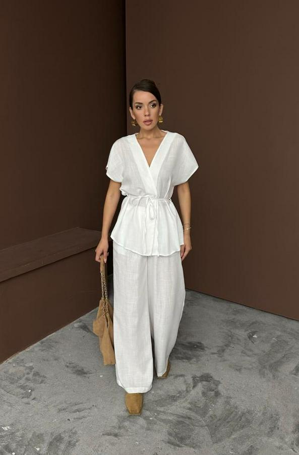 KETEN V YAKA BELDEN BAĞLAMALI BLUZ-PANTOLON TAKIM - Beyaz