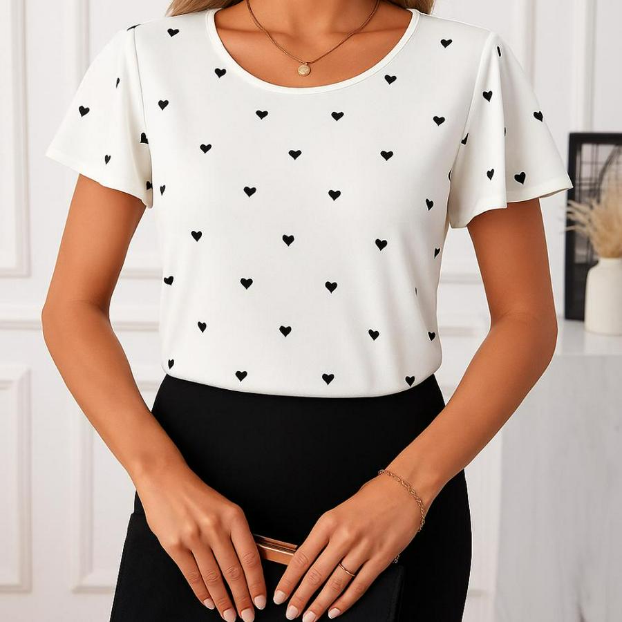 AnasayfaTüm ÜrünlerÜst GiyimBluz & TunikBluzKısa Kelebek Kollu Bisiklet Yaka Kalp Desenli Süprem Bluz