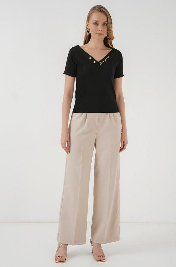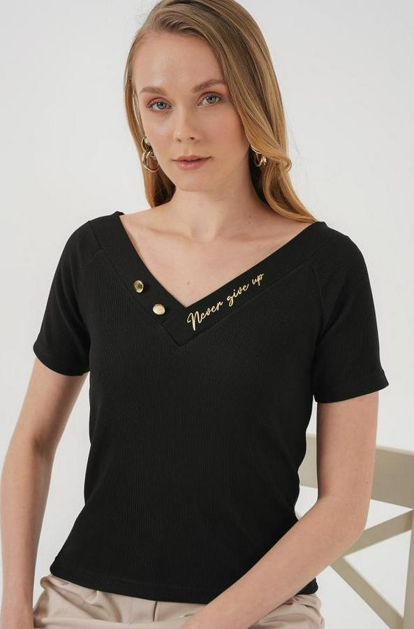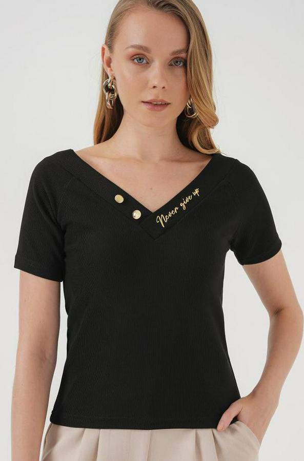 928 Kısa Kol V Yaka Bluz - Siyah