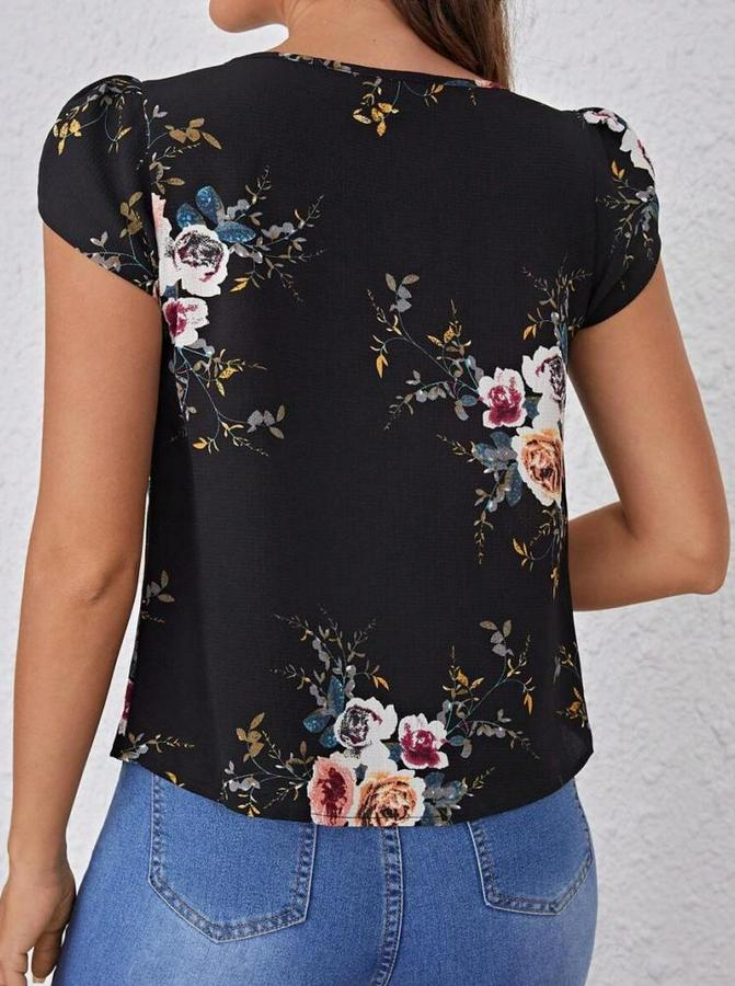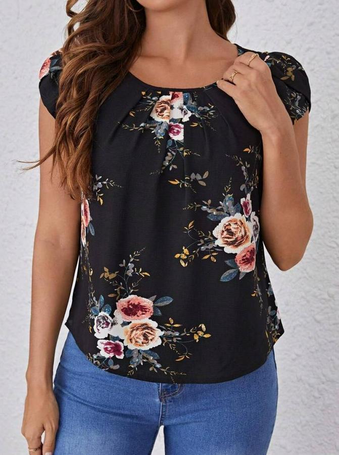 Kısa Kollu Bisiklet Yaka Çiçek Baskılı Süprem Bluz