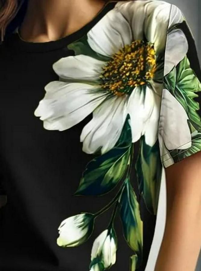 Kısa Kollu Bisiklet Yaka Çiçek Baskılı Süprem Bluz