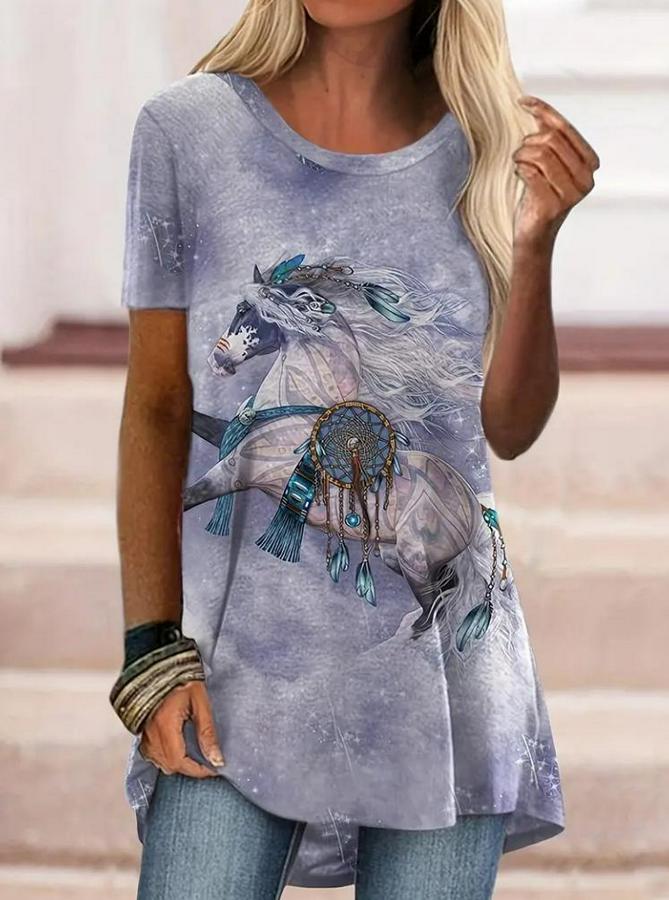 Kısa Kollu Bisiklet Yaka Mitolojik At Figür Baskılı Salaş Süprem Bluz