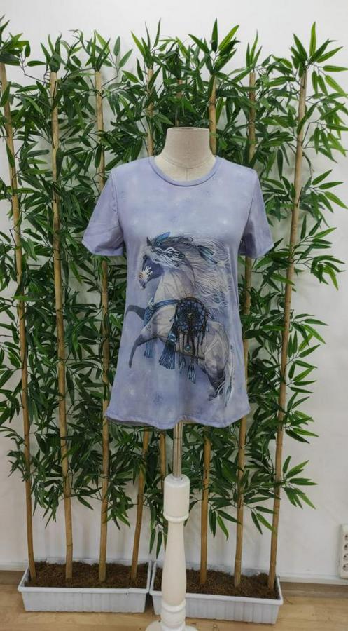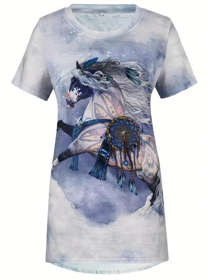 Kadın Kısa Kollu Bisiklet Yaka Mitolojik At Figür Baskılı Salaş Süprem Bluz