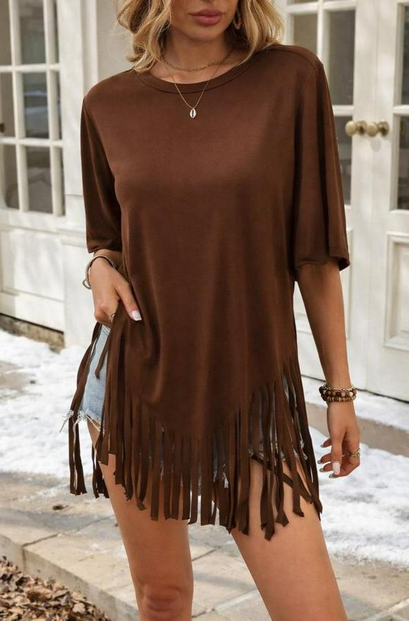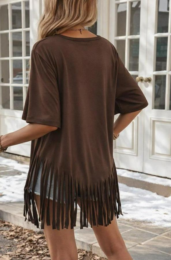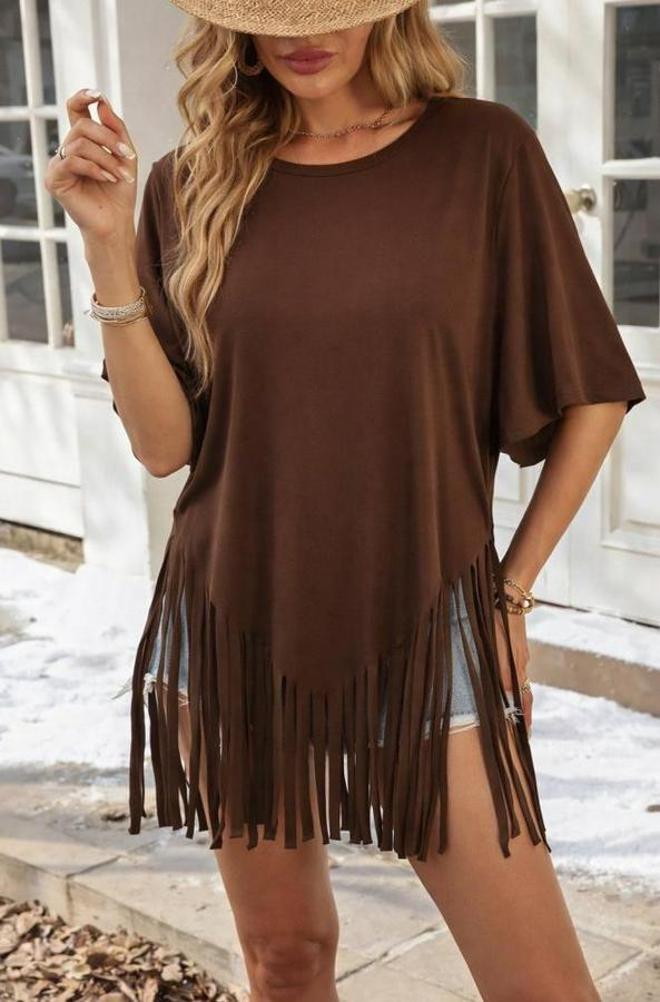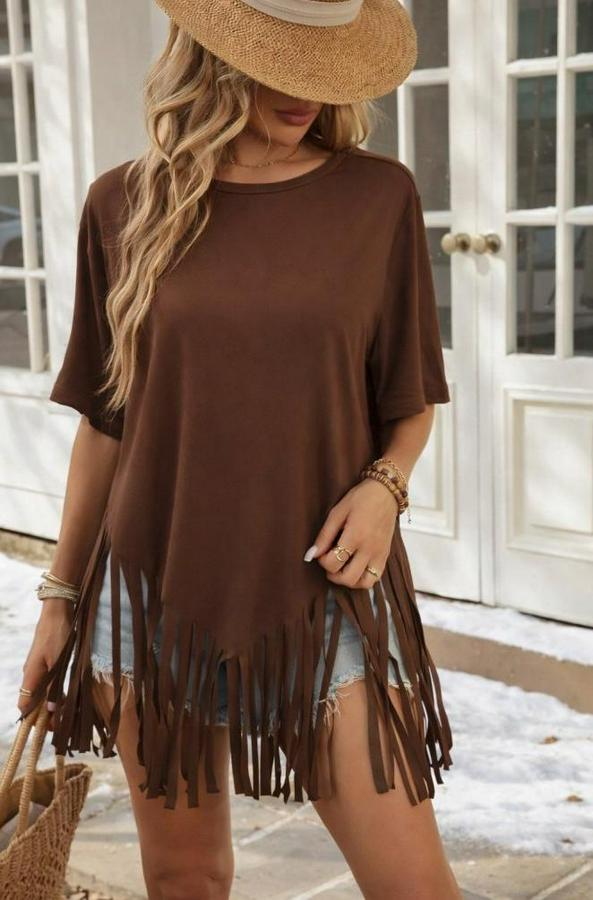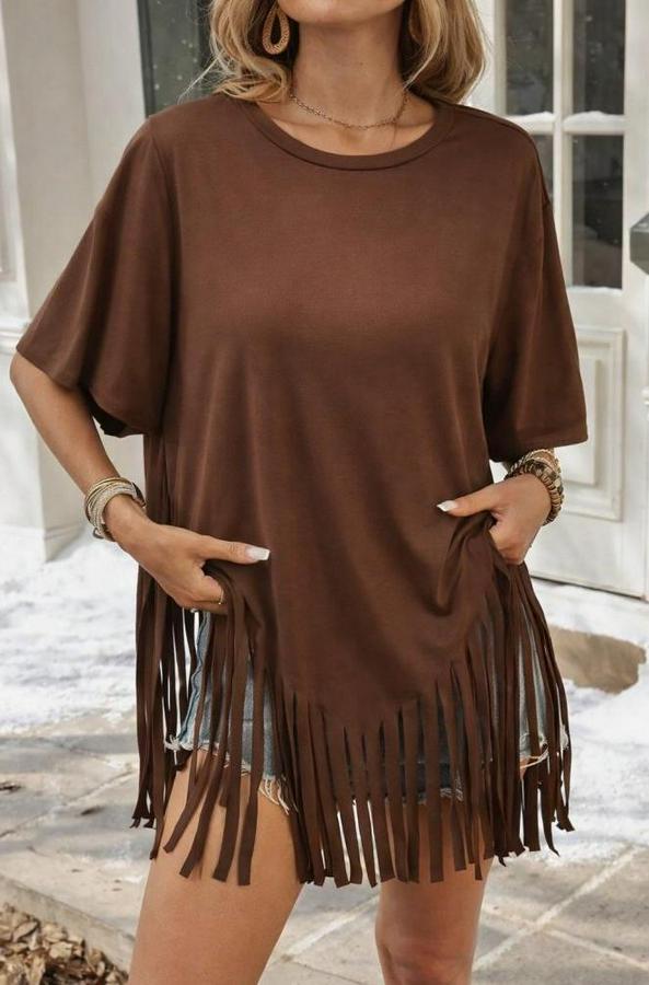 AnasayfaTüm ÜrünlerÜst GiyimBluz & TunikBluzKısa Kollu Bisiklet Yaka Püsküllü Viskon Bluz