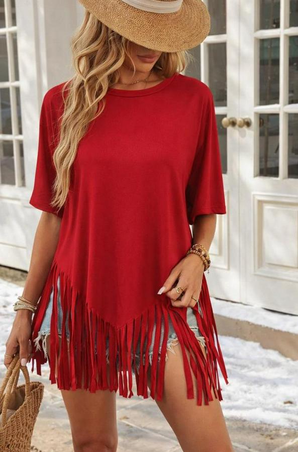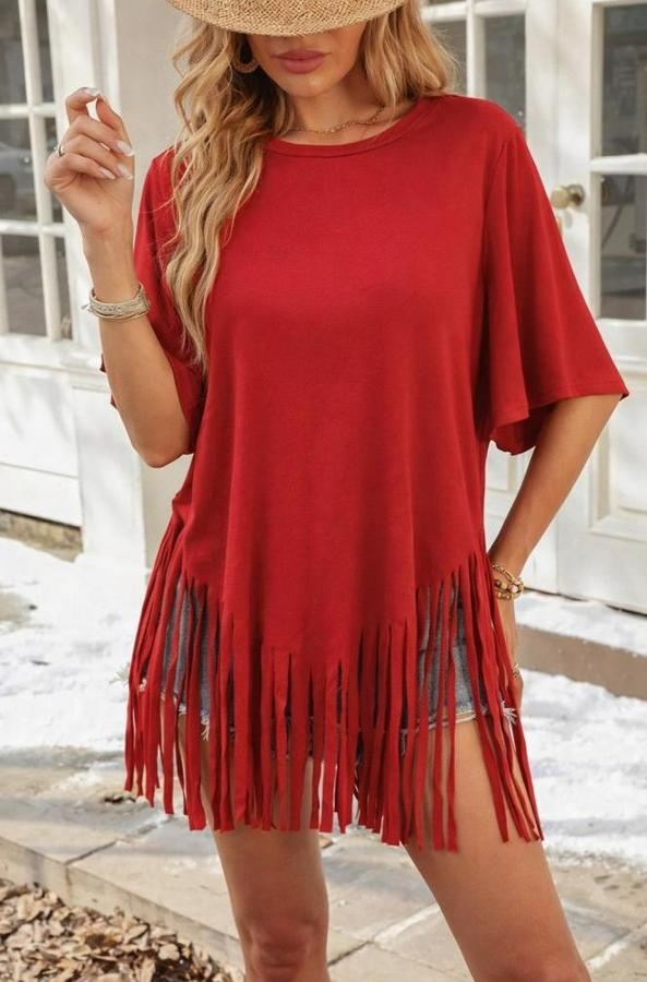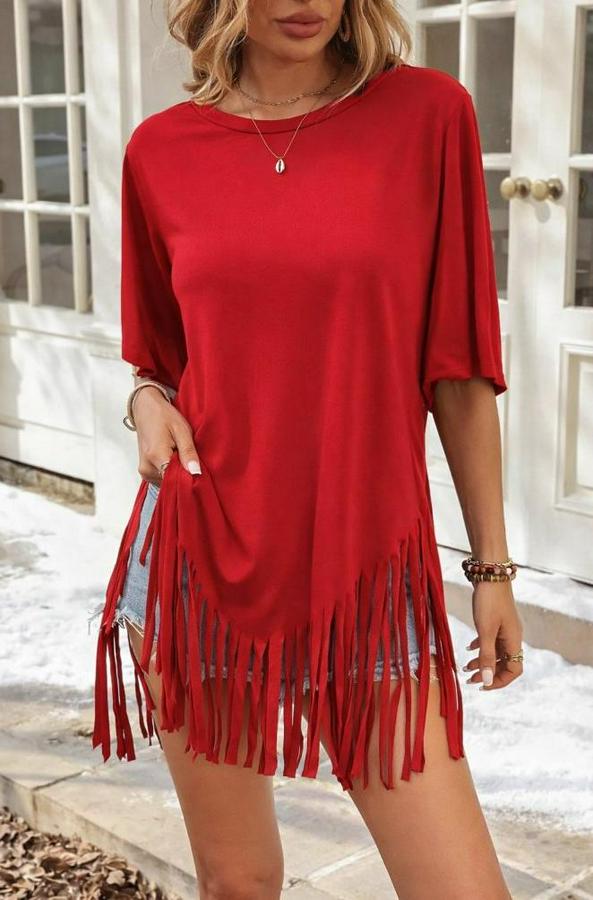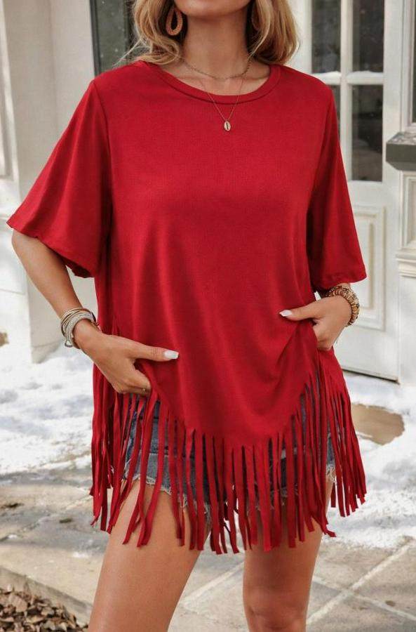 AnasayfaTüm ÜrünlerÜst GiyimBluz & TunikBluzKısa Kollu Bisiklet Yaka Püsküllü Viskon Bluz
