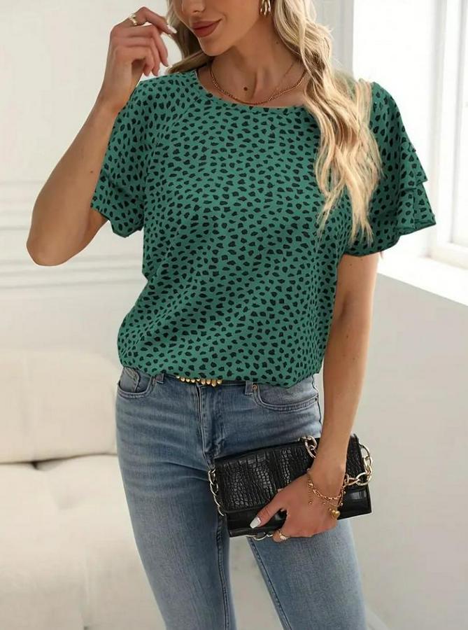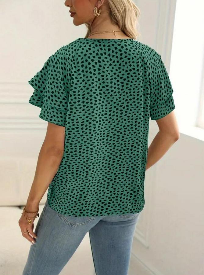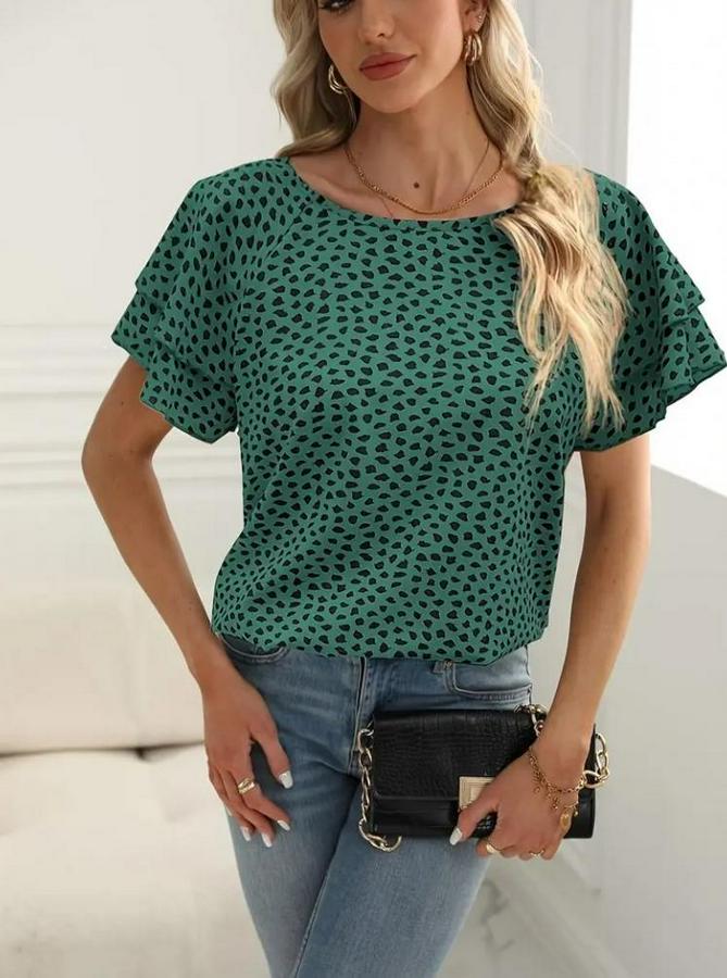 Kadın Kısa Kollu Kolları Volanlı Baskılı Süprem Bluz