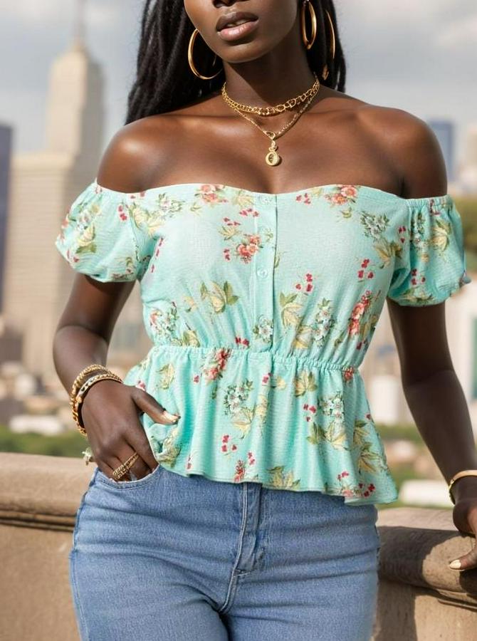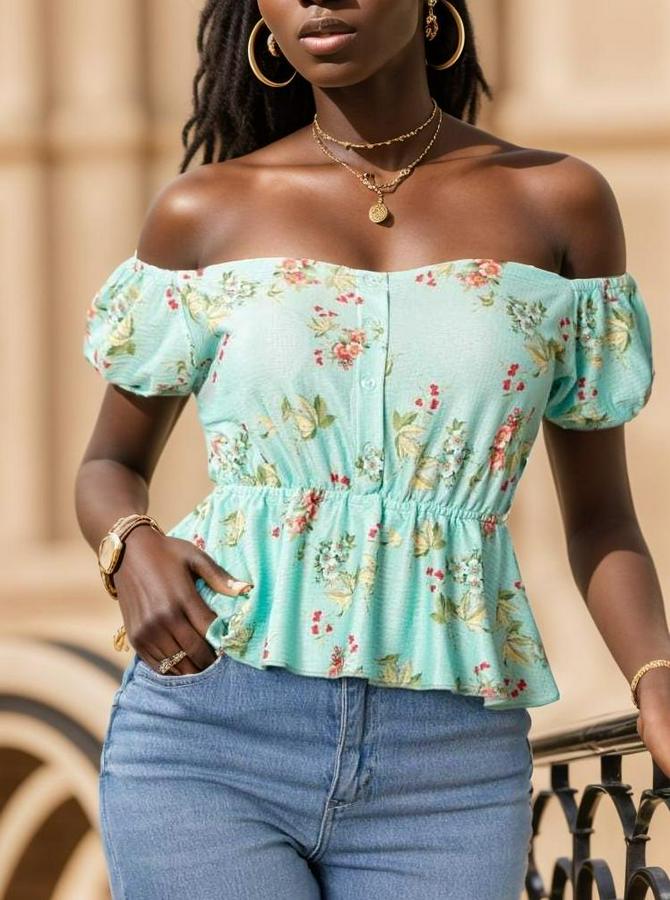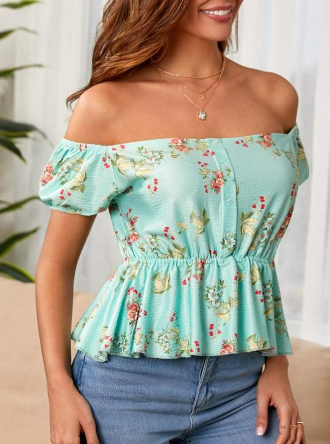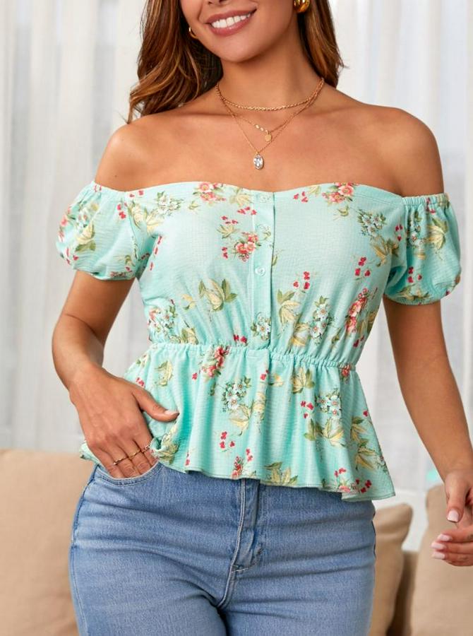 Kadın Kısa Kollu Madonna Yaka çiçek Desenli Düğme Detay Gipeli Süprem Kumaş Bluz
