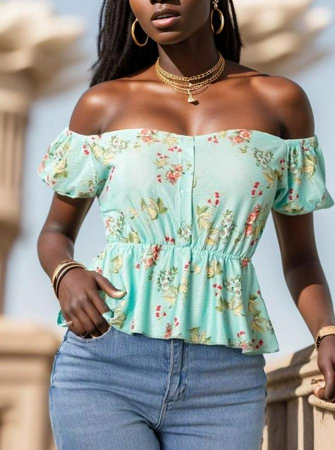 AnasayfaTüm ÜrünlerÜst GiyimBluz & TunikBluzKısa Kollu Madonna Yaka Çiçek Desenli Düğme Detay Gipeli Süprem Kumaş Bluz
