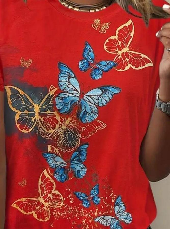 Kadın Kısa Kollu Mavi Sarı Kelebek Baskı Süprem Bluz
