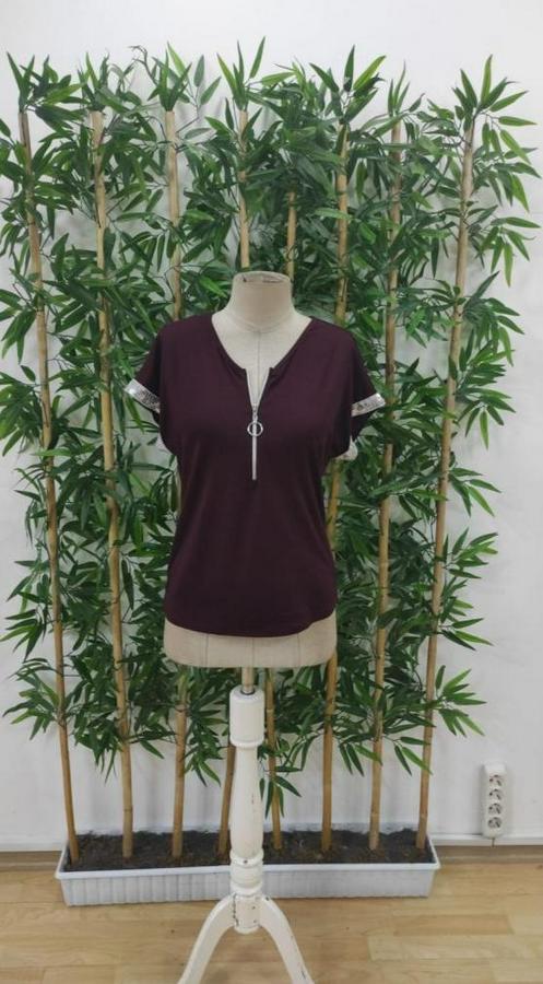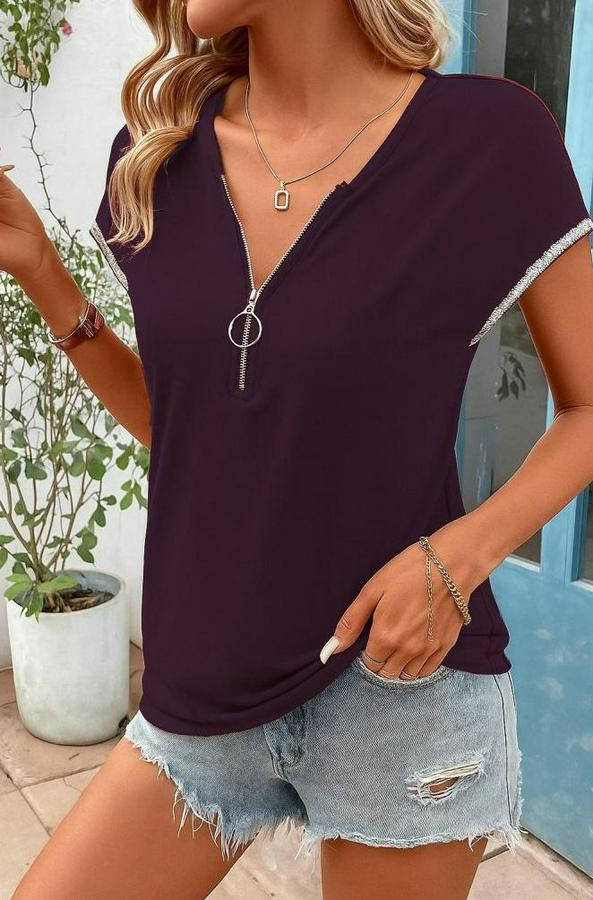Kadın Kısa Kollu önden Fermuarlı Kol Ucu ışıltılı Viskon Bluz