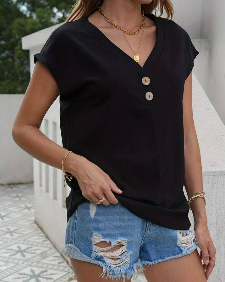 AnasayfaTüm ÜrünlerÜst GiyimBluz & TunikBluzKısa Kollu Önü Düğmeli V Yaka Aerobin Bluz