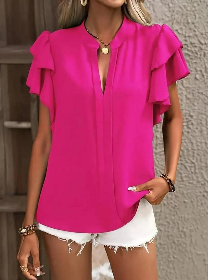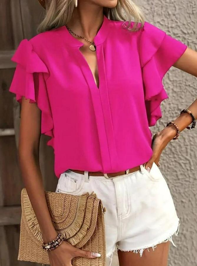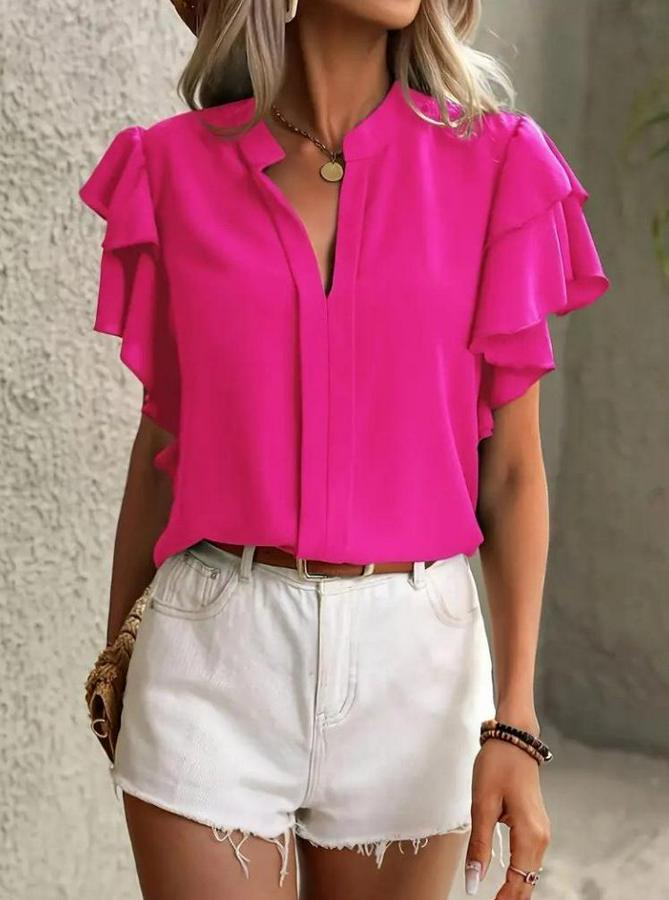 AnasayfaTüm ÜrünlerÜst GiyimBluz & TunikBluzKısa Kollu V Hakim Yaka Kolları Fırfırlı Dubai Bluz