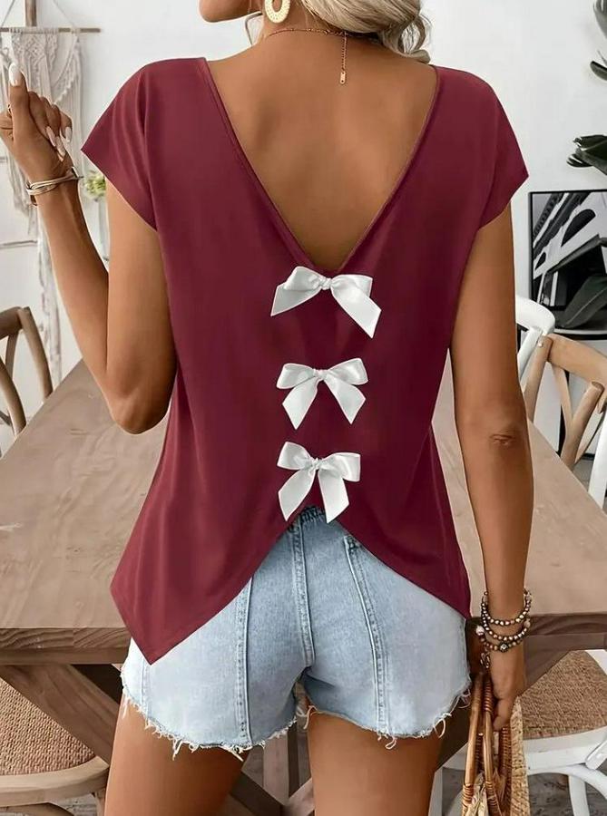 Kadın Kısa Kollu V Yakalı Arkadan Kurdele Detaylı Viskon Bluz