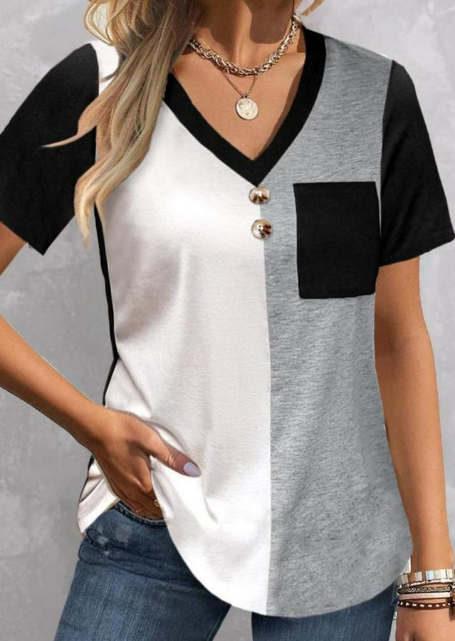 Kısa Kollu V Yakalı Cepli Önden Düğmeli Çift Renkli Viskon Bluz