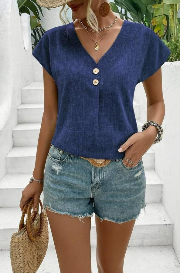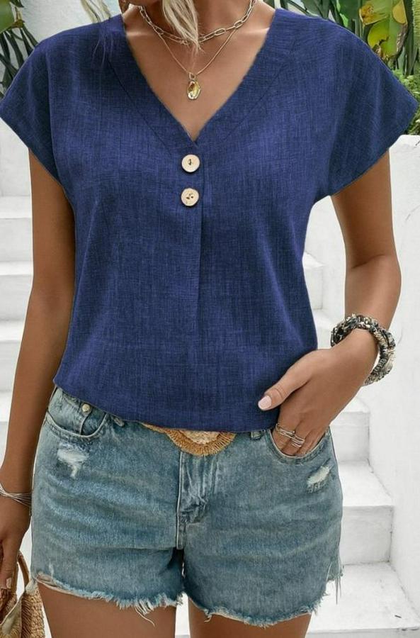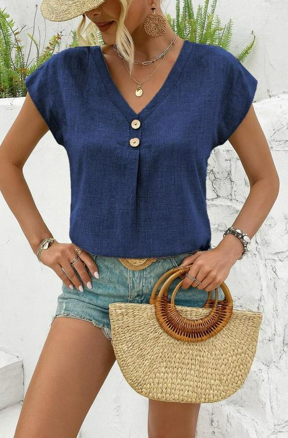 AnasayfaTüm ÜrünlerÜst GiyimBluz & TunikBluzKısa Kollu V Yakalı Düğmeli Keten Bluz
