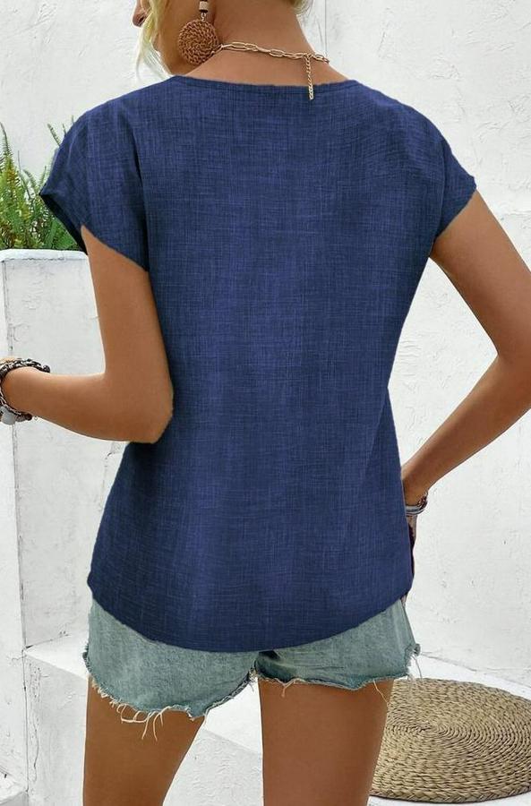 Kısa Kollu V Yakalı Düğmeli Keten Bluz
